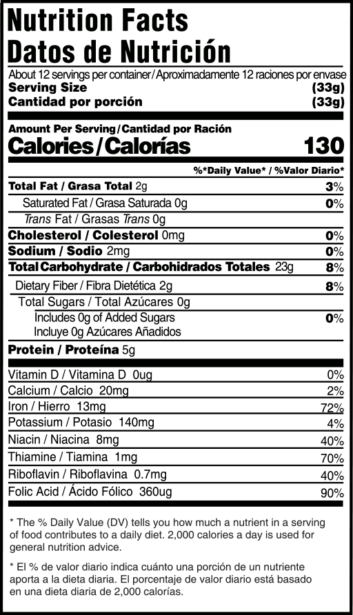 Ingredientes: Trigo fortificado con tiamina, riboflavina, niacina, hierro y acido folico, afrecho de trigo y canela