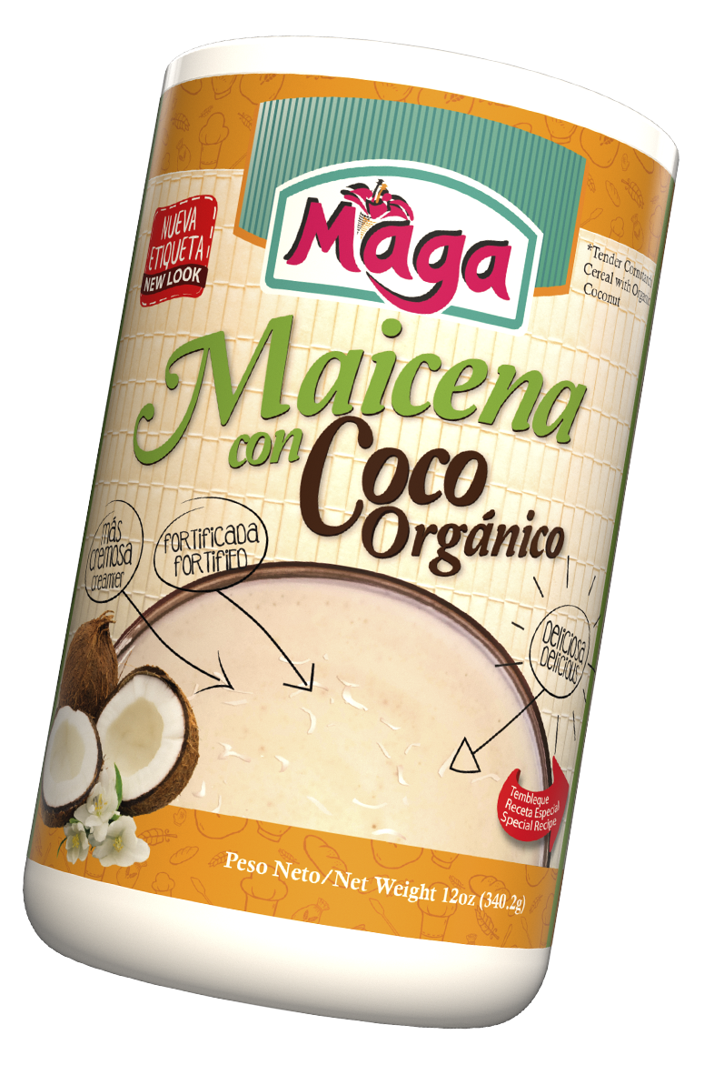 Ingredientes: Maicena fortificada con tiamina, riboflavina, niacina, hierro, ácido fólico, harina de coco orgánica, canela, vainilla, saborizante de coco natural.