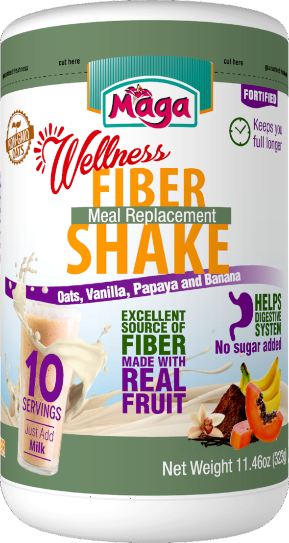 Complementa tu nutrición con nuestra deliciosa Maga Wellness Fiber Shake la misma es excelente fuente de fibra y fue confeccionada con frutas 100% reales: guineo, papaya, vainilla y semillas de linaza.